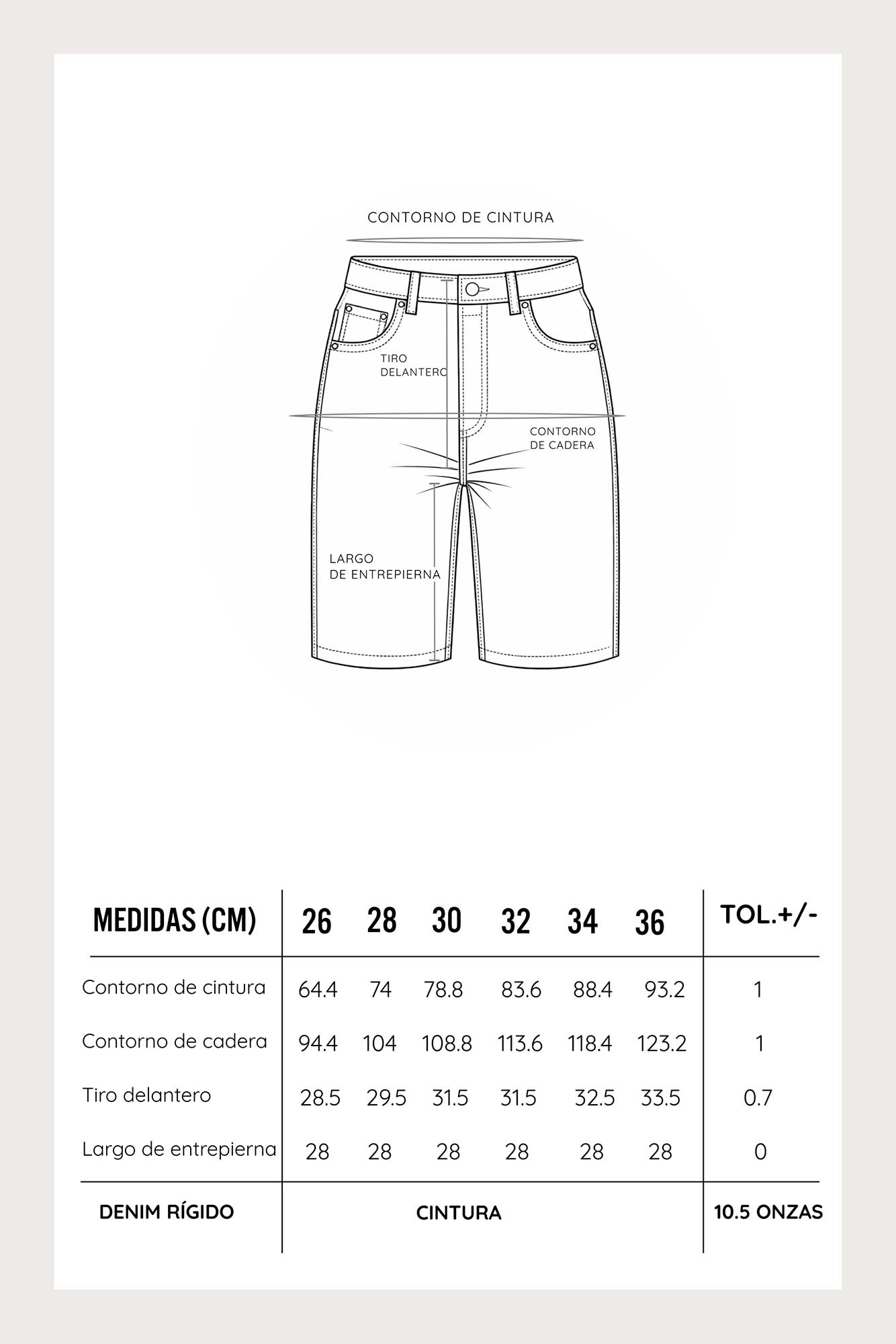 Presenta un tiro alto que favorece la cintura y un corte de pierna recta que llega justo por encima de la rodilla. Diseño tradicional de cinco bolsillos, cierre frontal con cremallera y botón metálico.