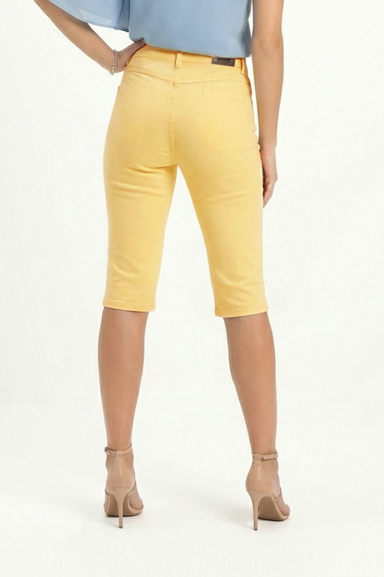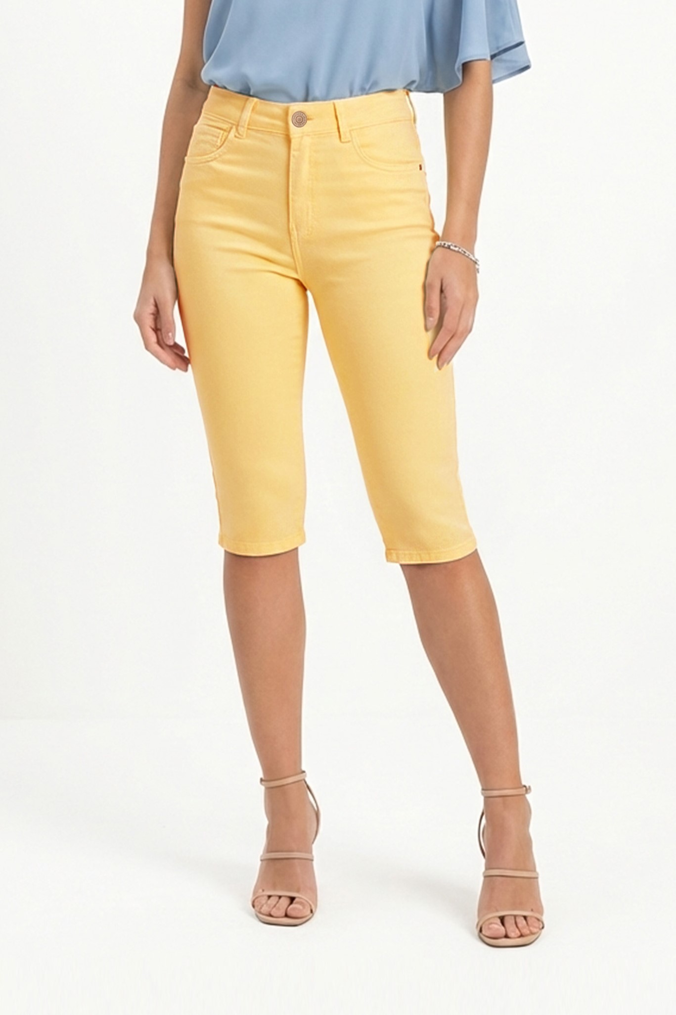 Capri (Pescador) de corte entallado tiro alto con cierre de botón y cremallera frontal, color amarillo pastel sólido de alta visibilidad y blanco, largo por debajo de la rodilla, ideal para temporadas de transición.