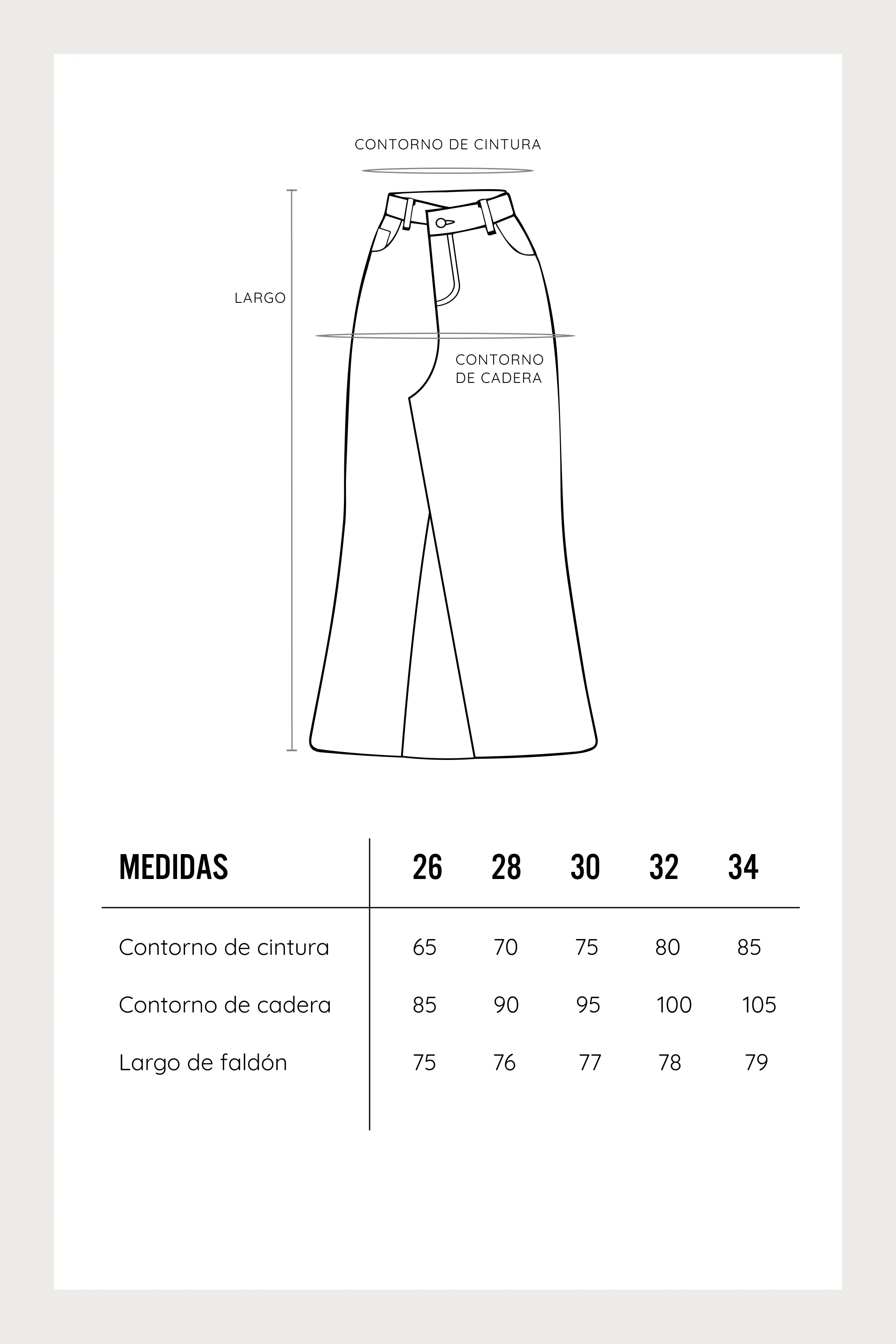 Falda larga denim de tiro alto y cintura asimétrica. Efecto lavado. Bajo asimétrico con abertura. Cierre frontal con cremallera y botón.