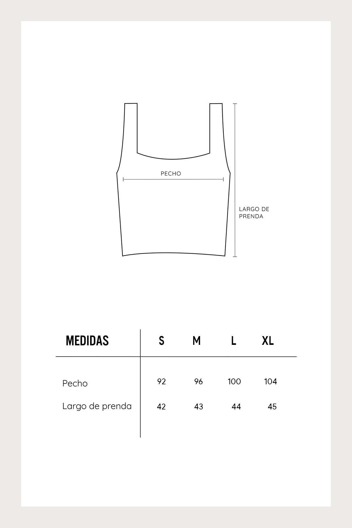 Cuello en "V" tanto en la parte delantera como en la posterior, que estiliza el torso y aporta un toque femenino, cremallera metálica expuesta en la espalda, que facilita el uso y añade un detalle de contraste industrial. Corte crop, pensado para quedar justo por encima de la cintura, ideal para combinar con prendas de tiro alto.